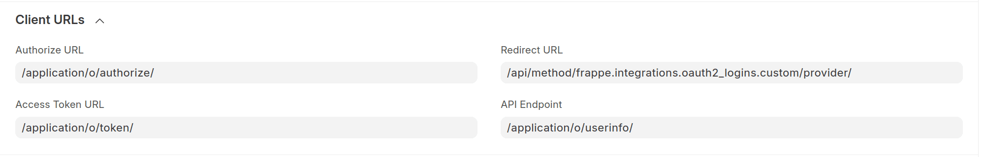 • Redirect URL: https://frappe.company/api/method/frappe.integrations.oauth2_logins.custom/<provider-name> (replace <provider-name> with the name of the provider in Frappe)